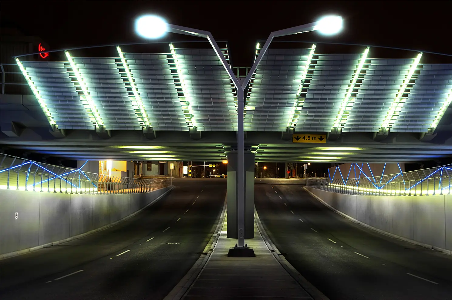 Maintaining full CP Rail operations during construction of the underpass proved to be the project’s greatest technical challenge and success. This aspect of project implementation was achieved only through the collaboration between CP Rail, the East Village, the City of Calgary and the consulting team. Apart from wide, pedestrian-friendly sidewalks and dedicated bicycle lanes, the underpass features state-of-the-art LED lighting in its walls and handrails to make the space brighter and more engaging.