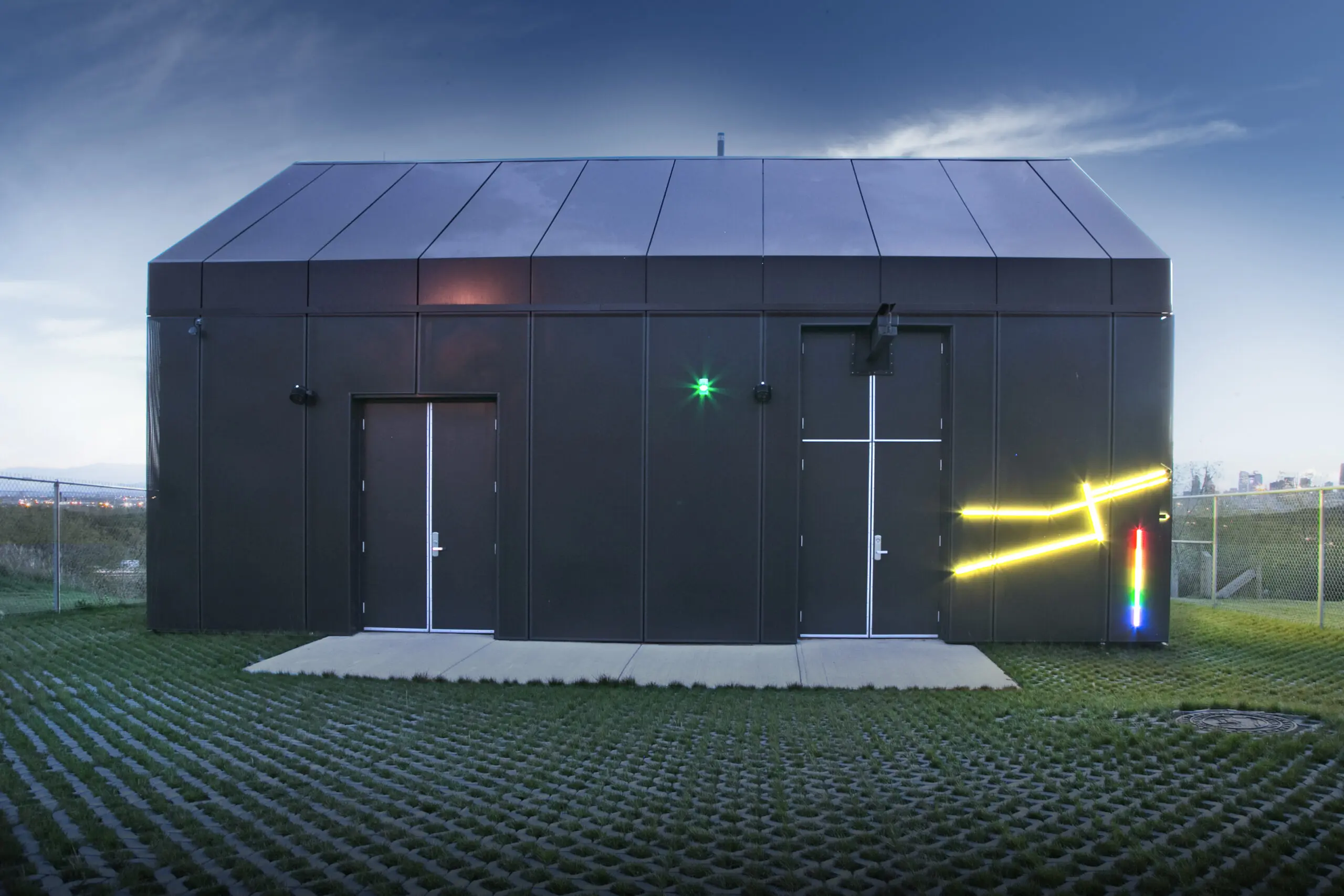 Clad in perforated metal panels, the building has a simple iconic form. On the north face, an interactive monitoring system displays the volume and flows of the water systems through the community and into the lift station using a vibrant, ever-changing LED light system illustrating how public art can become a driver in integrated design.